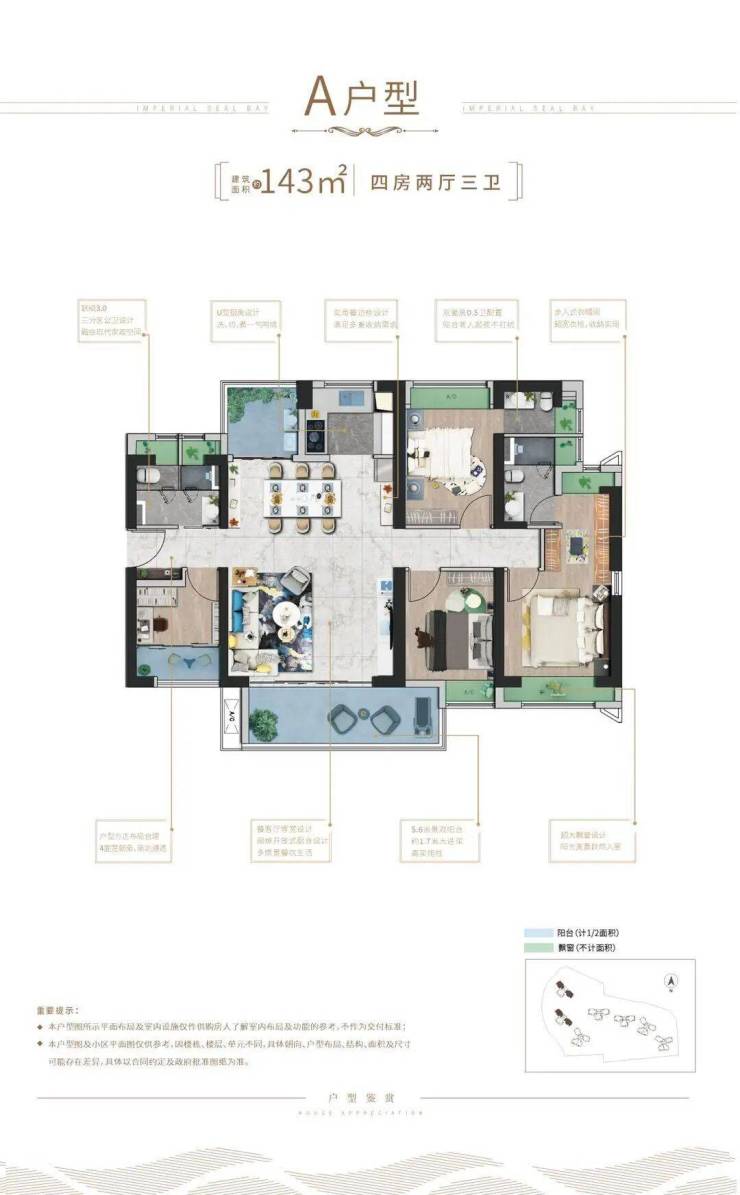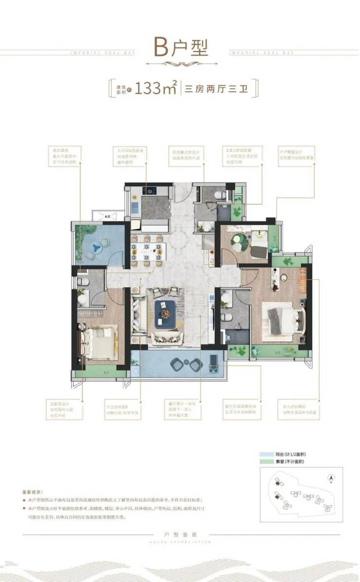 3.0户型匠心设计,室内空间采取双套房设计,将空间的奢阔尺度转化为人文的关怀深度;卫生间三分区规划,罕见的2.5卫豪奢配置,人性化关怀,细节成就长者美好生活,巨幕景观阳台,将一城盛景揽入眼底。