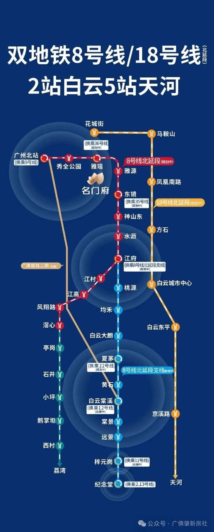 解答:项目紧邻在建地铁 8 号线北延段雅源站(距离项目 500 米),往北三站接驳广州北站 TOD 实现空铁联动,往南经 8 号线北延段支线直达越秀纪念堂站,享受全市一小时生活圈,一站之隔的雅瑶站点已进入施工阶段。距离在建的 18 号线北延段凤凰南路站 2 公里,5 站直达天河,交通便捷高效,满足业主日常通勤与休闲出行需求。