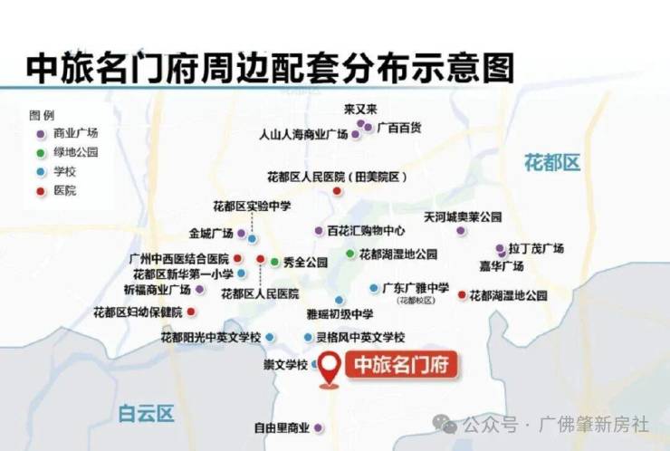 项目周边生活配套设施成熟,商业方面拥有 7 大商业广场,包括自由里、广州北站旅游零售综合体(在建)、骏壹万邦、大润发、广百百货、嘉华广场、拉丁茂广场等,涵盖购物、餐饮、娱乐等多元业态,满足业主日常生活与休闲需求。医疗方面,3 大医院环绕,花都区人民医院、中山大学附属仁济医院(在建)、白云区第二人民医院,为业主健康提供全方位保障,实现安心生活,随时有 “医” 靠。生态方面,2 大 4A 级生态公园(花都湖公园、秀全公园)提供城市里的公园式鲜氧生活,提升居住舒适度。