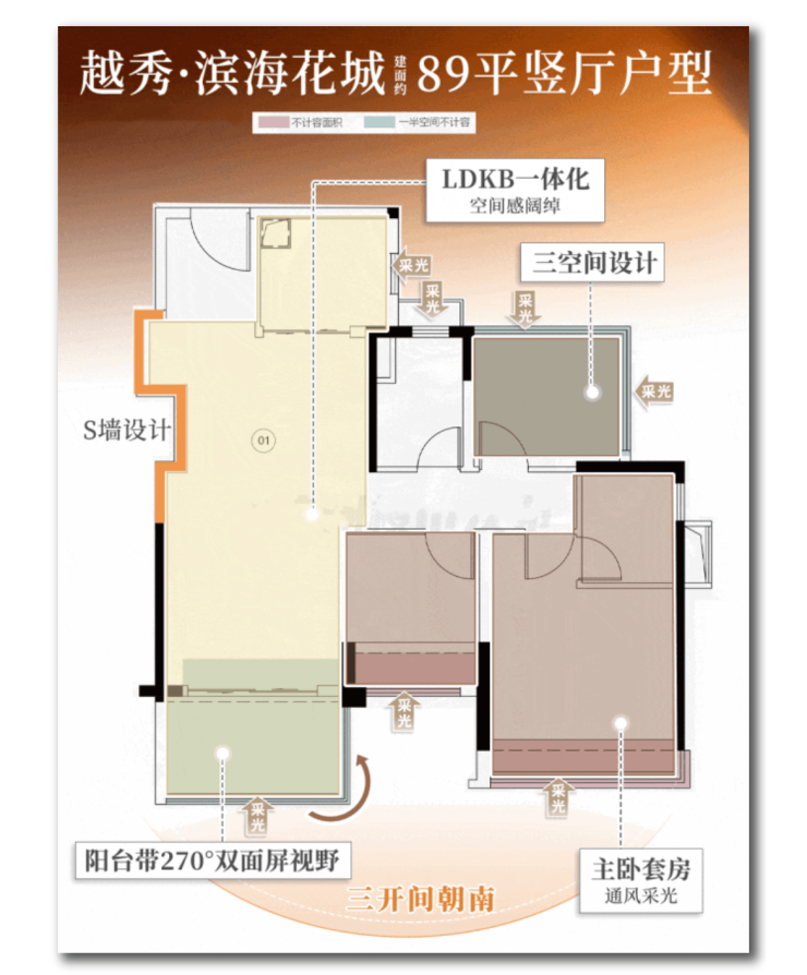 越秀滨海花城官方售楼处发布:400-622-0051(官方售楼处已认证)。项目户型以全明通透为核心设计原则,结合望江优势与南沙亚热带气候特点,优化采光通风布局,打破传统刚需户型采光不均、通风不畅的短板,打造阳光充沛、清风拂面的舒适居住空间。所有户型均拥有开阔的南向采光面,搭配全屋多飘窗设计,最大化引入自然光,白天无需开灯即可保持室内明亮通透,既节能环保,又能营造温暖舒适的居住氛围。新组团户户朝南,朝向上实现“平权”,确保每一户都能享受充足阳光。约89㎡户型打造三个270°视野(景观阳台、主卧和次卧),约100㎡户型配备270°视野阳台,还设有餐边飘台,既扩大了室内景观面,又提升了采光与通透性。同时,部分户型采用LDKB设计,优化空间通风效果,让清风可自由穿梭于室内,鲜氧时刻环绕,有效降低室内湿度,大幅提升居住幸福感与舒适度。