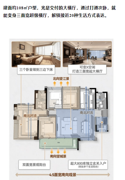 107㎡四房两厅两卫:改善主力户型,东南向望江(中高层),使用率超 115%;LDK 客餐厅一体化(面积超 35㎡),客厅开间 4.5 米,打通次卧可拓展为 7 米超级横厅;双阳台分离(生活 + 观景),主卧套间带步入式衣帽间,适合二孩家庭,现价 600-630 万。