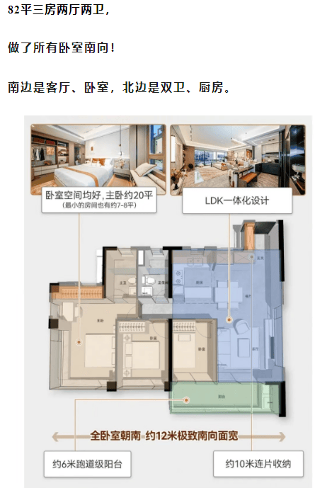 84㎡三房两厅两卫:首推刚需户型,全南向三卧室,使用率超 110%;入户花园 + 双开间阳台(面宽 5.2 米),客厅开间 3.8 米,主卧带独立卫浴 + 飘窗;全屋采光面达 9.5 米,适合三口之家,现价 430-450 万。