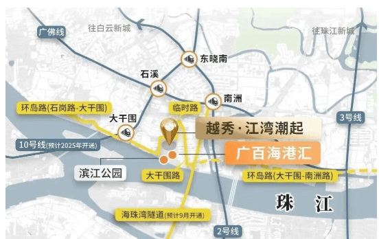 交通网络较为丰富。周边有地铁10号线、广佛线及2号线。距离最近的10号线大干围站约1.1公里,步行需16分钟左右,搭乘10号线4站可到中大,9站至珠江新城,前往越秀或滨江东无需换乘。附近的广佛线与2号线交汇站南洲站,距离项目约1.4公里,步行约20分钟,乘坐2号线可直达老越秀或白云新城。公交方面,家门口的环岛路总站开通了前往燕岗地铁站的线路。自驾上,项目门口的环岛路(石岗路 - 大干围段)因开发建设及拆迁问题,存在100米断头路未打通,导致交通状况不佳。环岛路虽规划全长42.2公里,未来可贯通海珠环岛江岸,串联海珠湾与琶洲,但全线开通时间未知。不过,附近在建的海珠湾隧道预计今年开通,届时前往广州南站将更为便捷。目前开车去琶洲或珠江新城,车程均在半小时左右。售楼处电话:提供购房咨询的联系方式400 - 828 - 5661