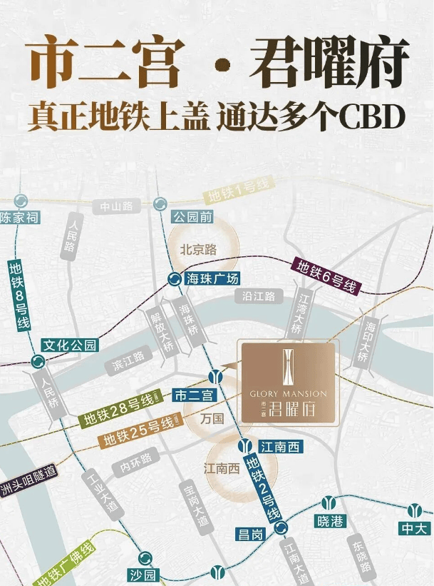 君曜府坐落于广州第一中轴南拓首站——市二宫板块,占据千年中轴正脉与珠江水脉黄金交汇点,是海珠桥头的重要枢纽。作为该区域近十年来唯一的全新盘,君曜府旨在重塑板块居住价值,成为主城核心、珠江主航道稀缺资产。
