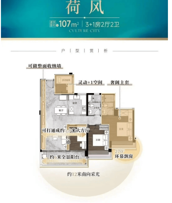 建面约107㎡四房:该户型主打刚需改善,拥有12米南向采光面,通透LDK一体化设计让空间更显开阔,约6米奢阔阳台衔接客厅与卧室,兼顾采光与观景需求。同时配备独立入户花园,可作为玄关、储物间或绿植区,丰富空间功能。每个卧室均保证舒适尺度,实现三面下床,可轻松摆放衣柜与书桌,满足家庭日常居住需求。