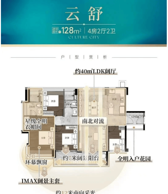 建面约128㎡四房:定位中端改善,做到约16米南向采光与南北对流,通风采光效果极佳。约40㎡LDK阔厅设计,碾压市场同面积产品,可满足家庭聚会、孩子玩耍等多元场景需求。空间布局合理,动静分区清晰,主卧套间配备独立卫浴与衣帽间,兼顾私密性与尊崇感,适合三口或四口之家居住。