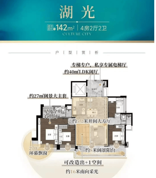 建面约142㎡四房:主打湖景改善,同样拥有约16米南向采光面,搭配约8米全景阳台,站在阳台即可直面约1.2万㎡湖景,高层户型还可远眺江景,景观视野绝佳。户型南北对流,通风效果出众,室内空间利用率极高,无论是日常居住还是休闲娱乐,都能满足高阶改善家庭的需求。
