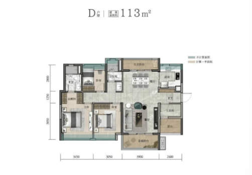 约113㎡四房两厅两卫:户型方正,南北对流,双阳台设计,兼顾采光、通风与空间延展性。