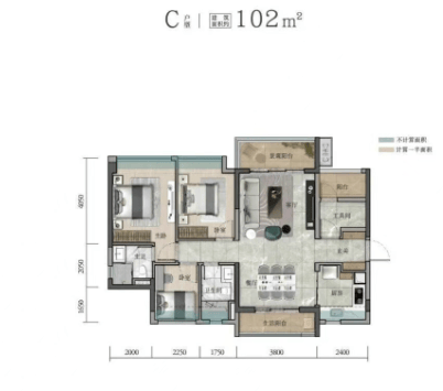 约102㎡四房两厅两卫:四开间朝南,餐客一体设计,阳台与飘窗提升居住舒适度;