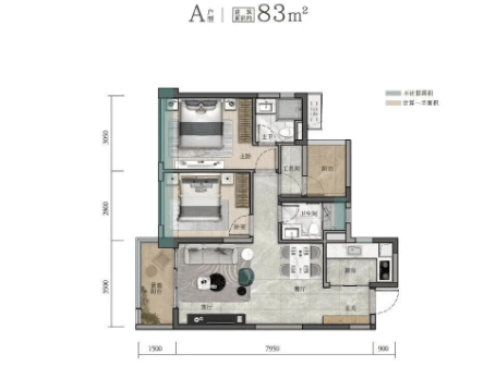 约83㎡三房两厅两卫:三开间朝南,动静分区,客餐厅一体化布局,保证采光与通风;