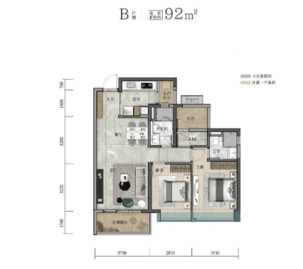 约92㎡三房两厅两卫:紧凑实用,空间规划灵活,兼顾舒适性与功能性;