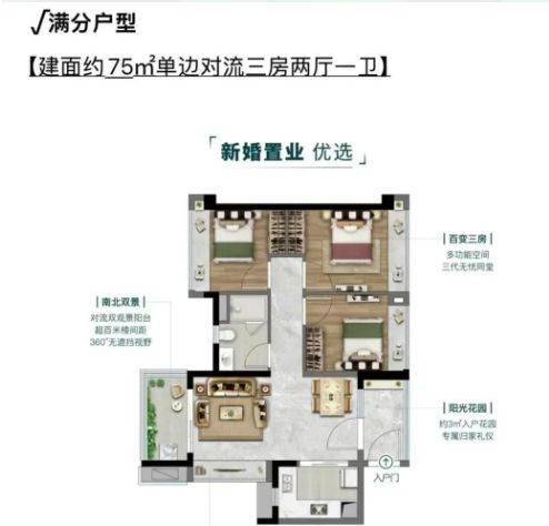 项目为现房交付,户型涵盖75㎡至107㎡的两至四房,满足刚需及改善型家庭的多样化居住需求。户型设计充分考虑通风采光、空间利用率及景观视野,部分户型配备大面积景观阳台及多处飘窗,实现居住舒适性与功能性兼顾。