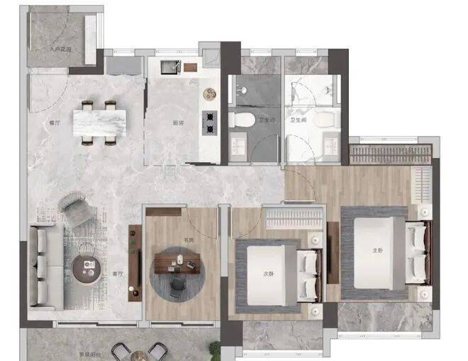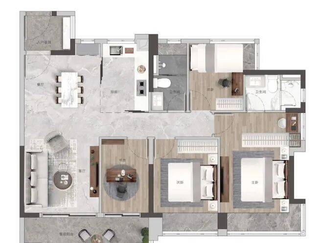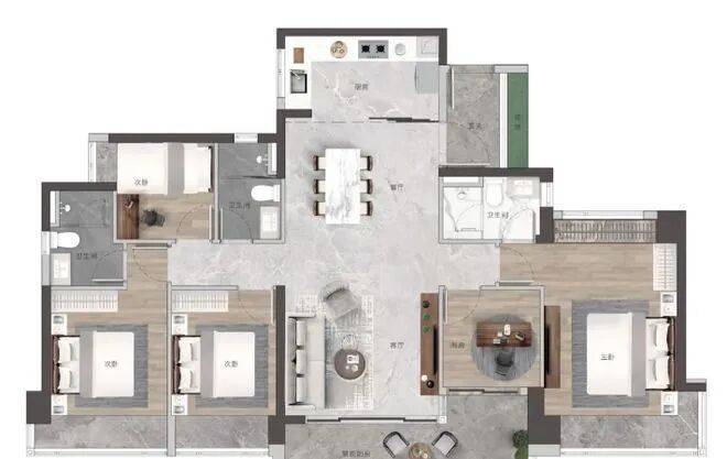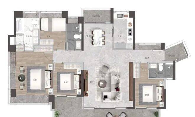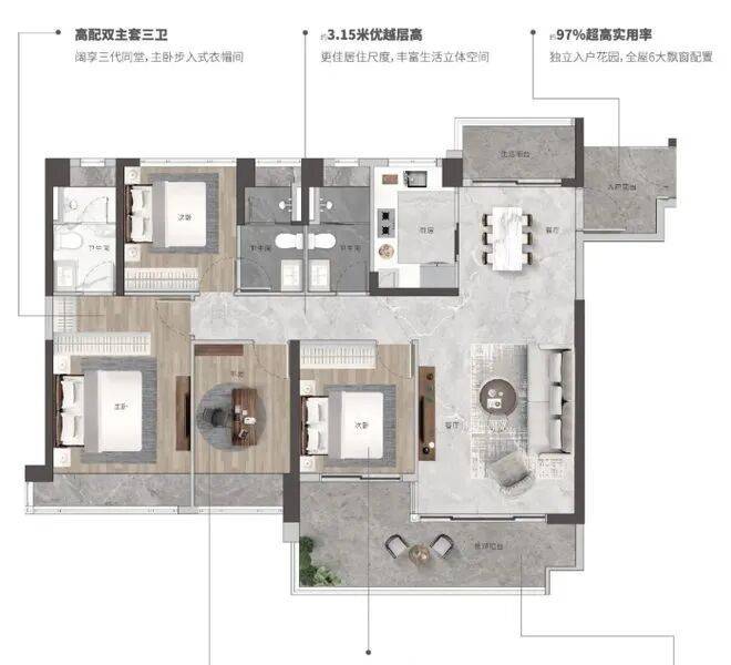 141㎡四房三卫:双主套设计,97%实用率,6.85米南向阳台,适合三代同堂;