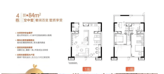 84㎡东南/西南/东北向户型:大户型设计,空间充足,布局方正,采光通风极佳,东南、西南向可享受一线江景与充足阳光,东北向视野开阔、环境清幽;4.5米层高打造复式中空户型,空间分层清晰,动静分离,可规划多个卧室、书房、客厅、餐厅,适合多人口家庭自住,舒适度极高;同时,该户型也适合高端办公或民宿经营,空间宽敞、配套完善,需求旺盛,收益可观。