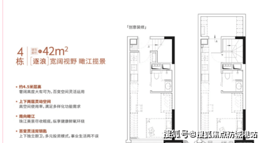 42㎡东南/西南/东北向户型:户型方正通透,采光通风俱佳,东南、西南向可享受充足阳光,东北向视野开阔、夏季凉爽;4.5米层高可打造复式中空户型,一层作为客厅、餐厅、厨房,二层作为卧室、书房,空间分层清晰,动静分离,适合小两口自住,兼顾舒适度与实用性;同时,该户型也适合投资,户型紧凑、需求旺盛,租金收益稳定。