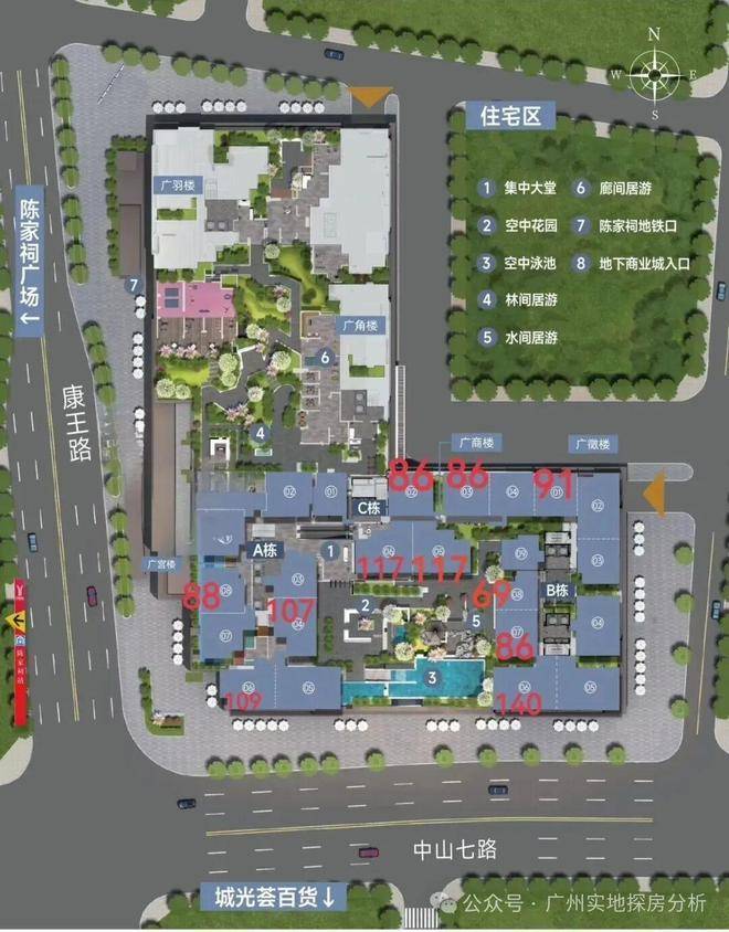 整个小区由六栋住宅组成,A栋26层,B栋和C栋各30层,D栋20层,E栋和F栋都是19层,总户数1027户,占地11075平方米,建筑面积超过13万方。社区自带7000多平方米的底商,引入了陶陶居这样的老字号餐饮品牌,日常买菜吃饭都方便。出门步行几分钟就是城光荟商超,再往外走一点,北京路、上下九、荔湾湖、西城都荟这些成熟商圈都在辐射范围内,老城生活的烟火气特别浓。