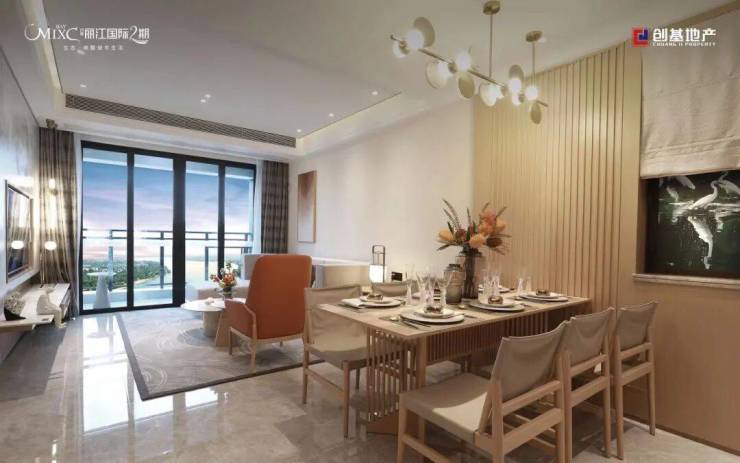 创基·丽江国际餐厅、客厅、阳台贯通一体的空间格局,予居者更开阔的视觉感受。罕见大开间设计,让沙发与背景墙之间视距宽敞,室内采光充沛。足够的尺度预留,确保餐桌与会客区间互不干扰,让用餐、会客分区独立,阔尺大宅,尊贵尽显。