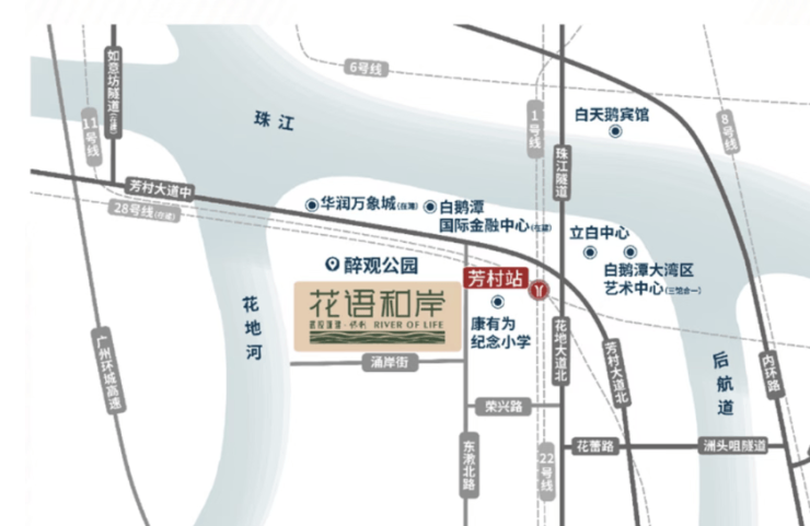 自驾路线:花地大道北接内环路,15分钟达珠江新城,20分钟达琶洲。
