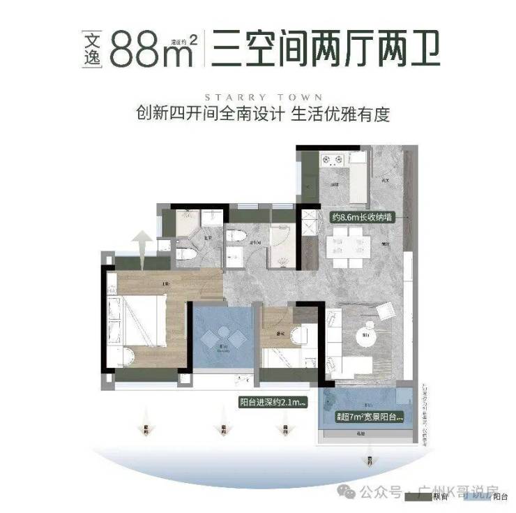 在售建面约88-125㎡三至五空间,户户朝南,皆为270°宽景大阳台,4-4.5面宽朝南,高使用率产品。