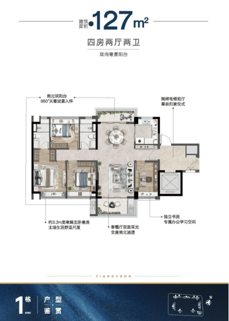 振业天成采用超常规的围合式布局设计,将原本规划的18栋住宅减少至10栋,每栋平均仅不到58户,使得建筑密度降至19.50%,容积率维持在2.0。主推户型包括建面约104至168平方米的全四房设计,两梯两户或两梯三户配置,有效提高了住户隐私性和舒适感。具体户型如下: