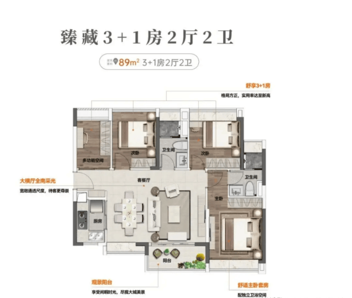 建面约89㎡四房两卫户型延续了高实用率的特点,空间尺度更为充裕,通透度出色,能满足多成员居住的私密性需求,适配人口稍多的刚需家庭。该户型主卧套房设计,配备独立卫生间和衣帽间,给予主人充足的私密空间;其余房间尺寸适中,布局合理,不会出现“小房间无用”的情况;客餐厅一体化设计,连接景观阳台,视野开阔,家庭聚会、朋友来访都能轻松应对,兼顾实用性与舒适性。