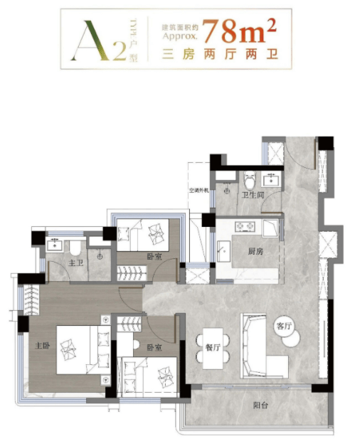 加粗1. 建面 78㎡三房两卫:刚需神户型,低总价实现主城三房梦