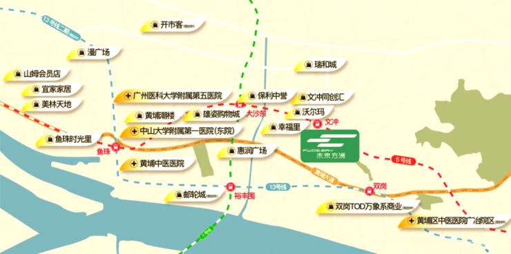 项目与地铁 5 号线文冲站 B 出口的直线距离仅 200 米,步行几分钟就能到达,300 米范围内还有地铁 13 号线双岗站,双地铁交汇的优势,让出行选择更多样。5 号线作为广州的黄金通勤线,串联起珠江新城、金融城、鱼珠 CBD 等核心商务区,从项目出发,3 站就能到达鱼珠,6 站直达金融城,9 站进入珠江新城,全程无需换乘,对于在这些区域上班的上班族来说,每天能多睡半小时,通勤体验直接拉满。