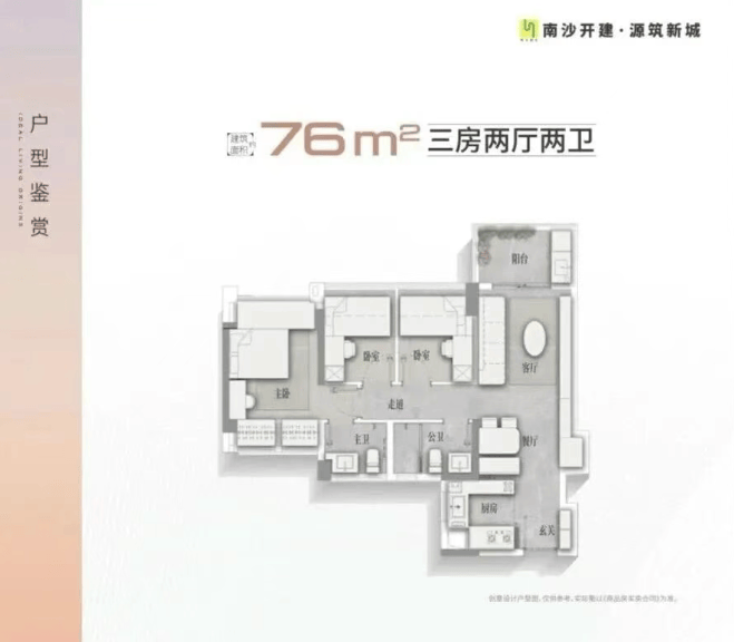 经济王牌:约76平方米稀缺三房两卫,LDKB一体厅设计,主卧套房。