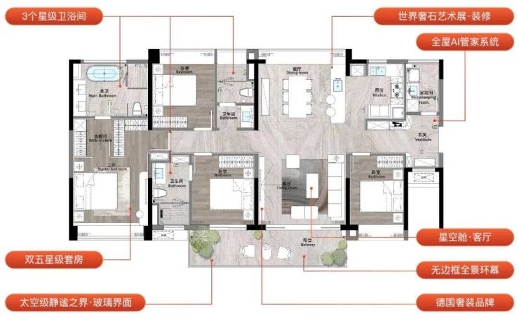 129-180㎡全四房,LDK一体化、主卧套间、部分超长阳台;精装用大金、唯宝等一线品牌。