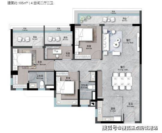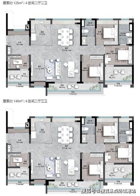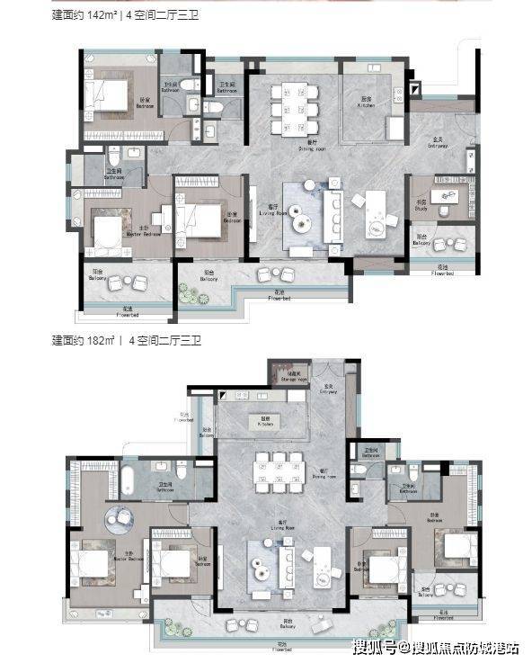 142㎡四房两卫:双主卧+南向大阳台,满足二胎家庭需求;