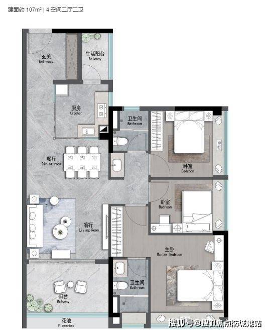 二胎家庭:142㎡四房,双主卧设计提升私密性;
