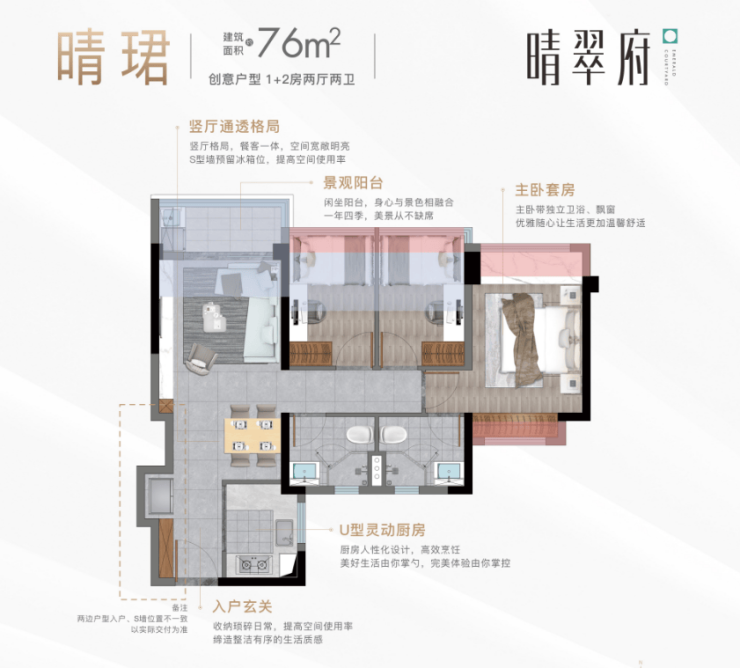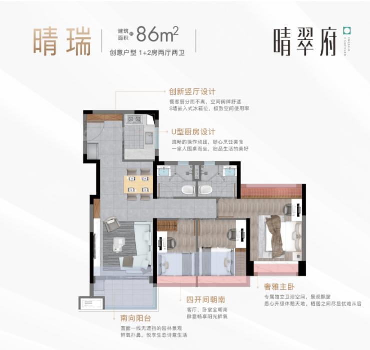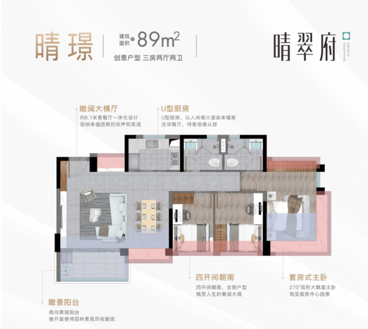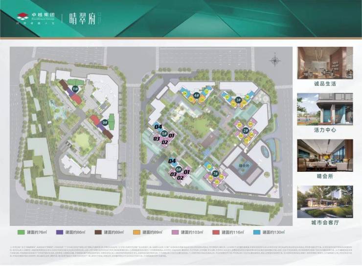 卓越晴翠府分为东西两个地块,共计10栋住宅楼。所有楼栋均采用V字型、蝶型、枪型布局,确保采光和视野最大化。最新加推的9号楼预计于2025年6月交付使用,目前在售户型包括76㎡三房两卫、86㎡三房两卫、89㎡三房四开间朝南、116㎡四房两厅两卫等,满足不同家庭结构的需求。