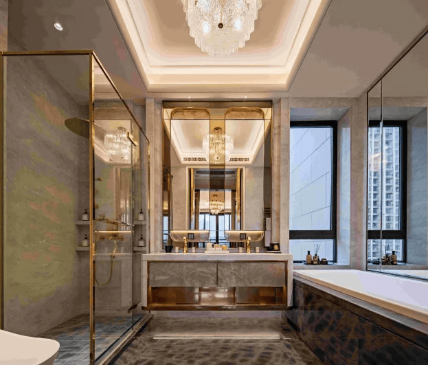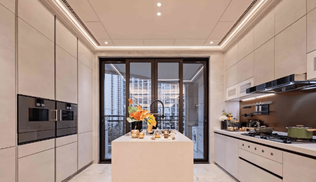 室内装修标准对标全球顶级豪宅。厨房全线采用德国Nolte或Poggenpohl定制橱柜,配备GAGGENAU全套厨电、美国白宫御用KALLISTA龙头、AXOR水槽及滨特尔净水系统。主卧墙面采用扪皮、玫瑰金不锈钢、刺绣墙布等材质,地板为与白金汉宫同款进口木地板;卫浴选用法国皇室御用THG龙头、意大利HAFRO按摩浴缸、日本TOTO座厕等国际一线品牌。每一寸空间,皆是奢侈品级的视觉与触觉盛宴。