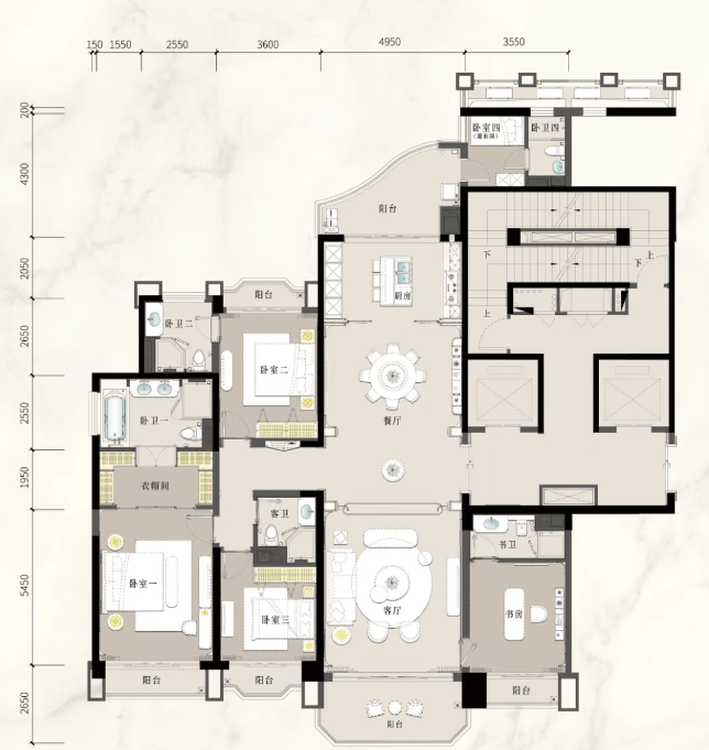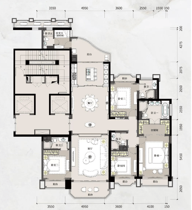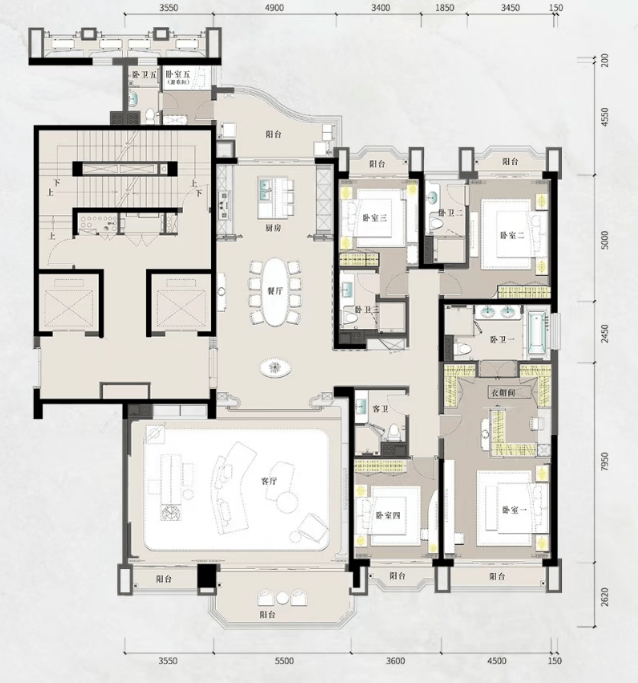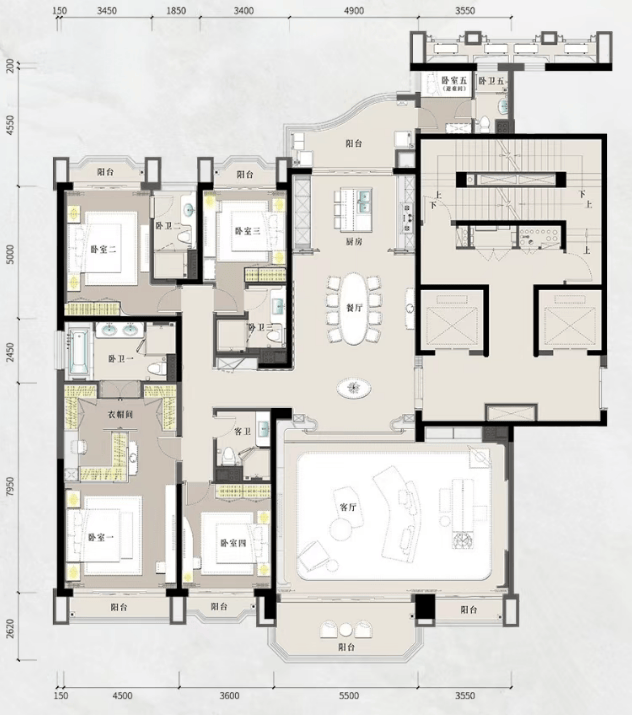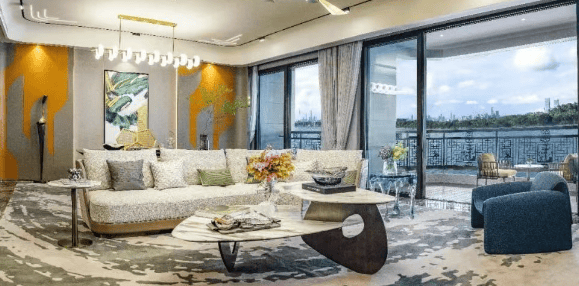 项目主力户型为建面约236–398㎡大平层,全部采用十字中轴九宫格布局,四开间朝南,客厅开间4.5–9.5米不等,层高达3.47–3.57米。以A1星涵印翠(317㎡)为例,双客厅打通后江景面宽近9米;特A星蕴檀意(398㎡)更设270°外飘休闲厅,十公里江城园景一览无遗。所有户型均为专梯专户设计,南北通透,户户望江瞰园,真正实现“江园双景入室”。