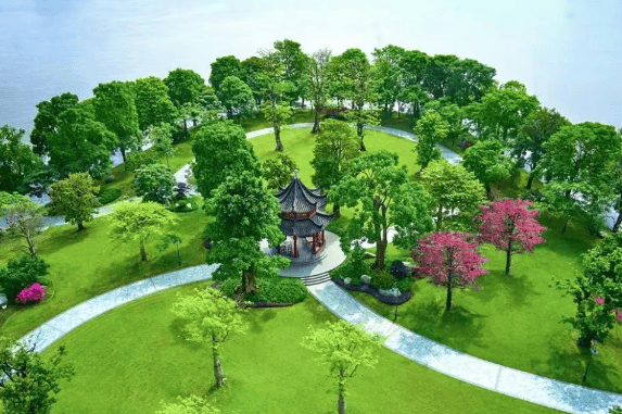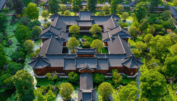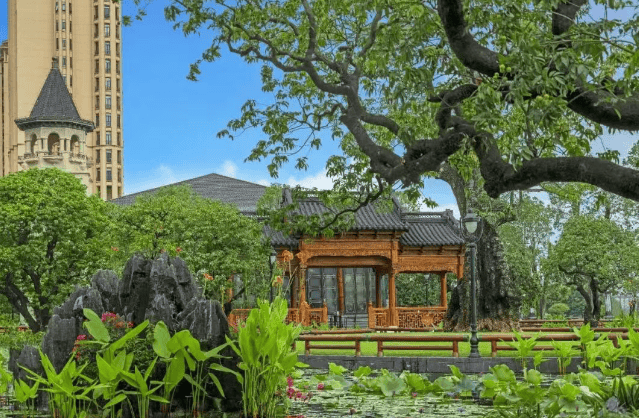 项目以“江园合一”为核心理念,打造夕露园与晨露园两大主题园林,并通过木栈道串联成壮阔的江园中轴线。夕露园取意陶渊明“夕露沾我衣”,融合建筑、绿植与江景,层层递进;晨露园则汇聚八角亭、珍木奇石,晨光初照时写意悠然。园区内设大型亲水荷塘,栽种200余棵高大乔木,搭配29组富贵绿石与英石,荷花摇曳,水影婆娑。更融合晋派建筑的恢弘气势与徽派园林的精巧细节,形成“园中有园”的中式人文胜境。