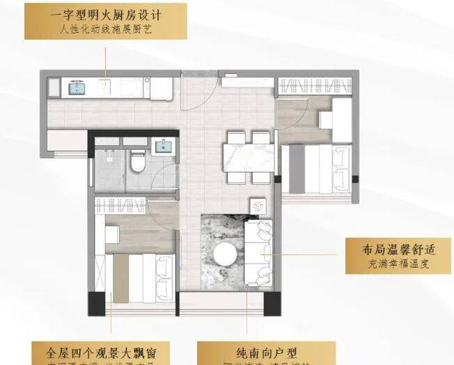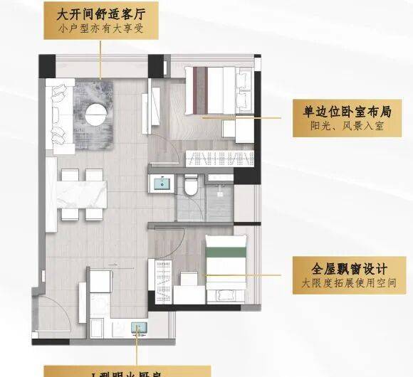 相比40平方米户型,空间更为宽敞,可以进行更明确的功能分区。独立的卧室、客厅与厨房区域划分清晰,客厅空间可容纳更多家具和活动,如摆放沙发、茶几,打造舒适的休闲区。