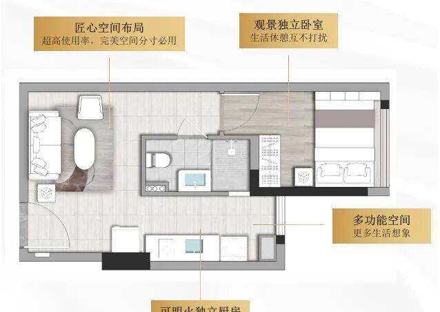 空间布局紧凑合理,通燃气、可明火的设计满足日常烹饪需求,让生活更具烟火气。采用开放式设计,将客厅、卧室与厨房区域灵活融合,通过设置榻榻米床、定制收纳柜等方式增加空间利用率。