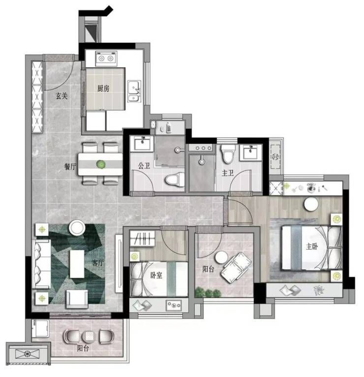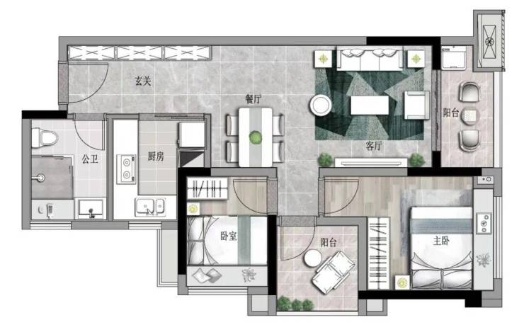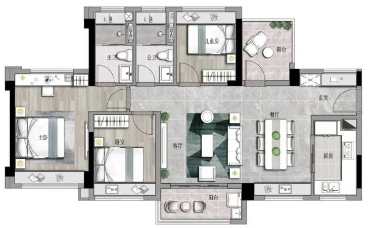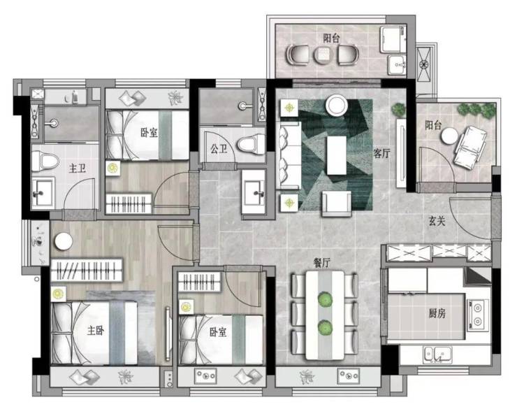 入户玄关带多功能收纳柜台,景观5开间,L型厨房,动线流畅。