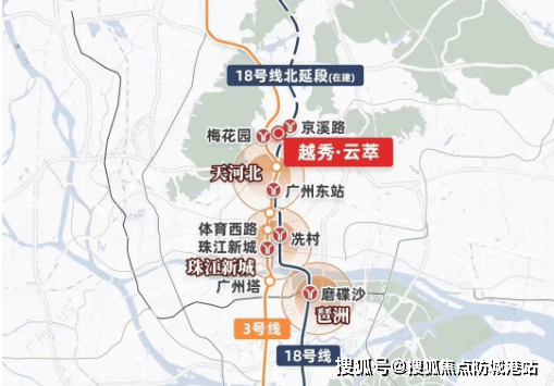 越秀・云萃地处中轴之上,地理位置优越,距离珠江新城直线距离约 5 公里,自驾可经由广州大道或沙太路快速抵达珠江新城 CBD,通勤便捷。项目还是双地铁项目,家门口就是 18 号线京溪路站,未来业主下楼乘坐 18 号线,无需换乘就能一线直达琶洲(磨碟沙站)、珠江新城(冼村站)、天河北(广州东站)、万博(南村万博站);步行约 800-900 米可到达 3 号线梅花园站,乘坐该线路同样无需换乘,便能抵达体育西路、珠江新城等核心区域,多维交通满足业主出行需求。