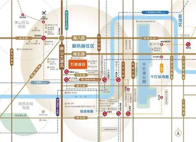灯湖首府所处位置享有“4纵4横4地铁1高铁”的复合交通体系。项目距在建的佛山地铁3号线佛山火车站约1公里,未来可换乘广湛高铁,一站直达广州站;周边还有佛山5号线(规划)、7号线(规划)及广州28号线(规划)等多条轨道线路辐射。驾车方面,紧邻已通车的海五路西延线,10分钟内可抵达千灯湖核心区或禅城区中心,早高峰打车到祖庙商圈平均耗时约22分钟。无论是日常通勤,还是周末带家人去保利水城看电影、到岭南天地喝下午茶,出行选择都足够灵活。