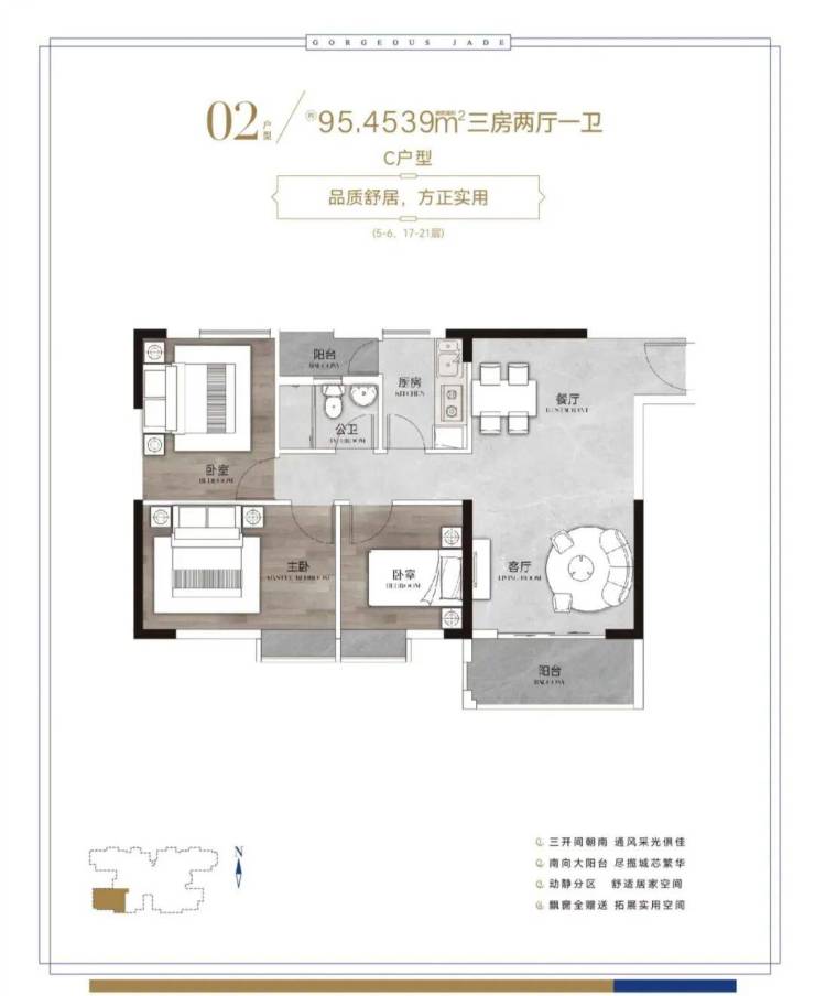 项目推出的户型涵盖79-103㎡的二至三房,其中主力户型为95㎡的南向大三房,三开间朝南,南北双阳台设计,通风采光俱佳。所有飘窗均为全赠送面积,进一步提升了户型的实用率。主卧空间宽敞,次卧灵活多变,可根据家庭需求调整使用功能。