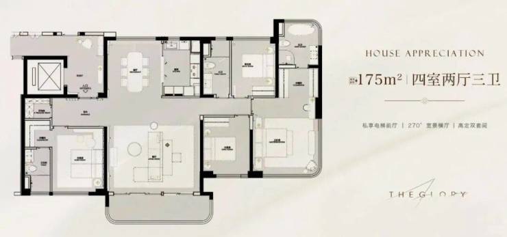 120㎡四房:总价约1140万元起,LDKB一体化设计,270°弧形落地窗,主卧套间带独立衣帽间,实际使用率105%