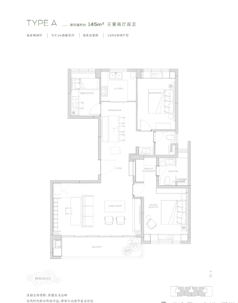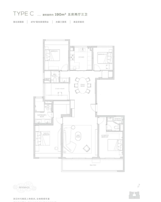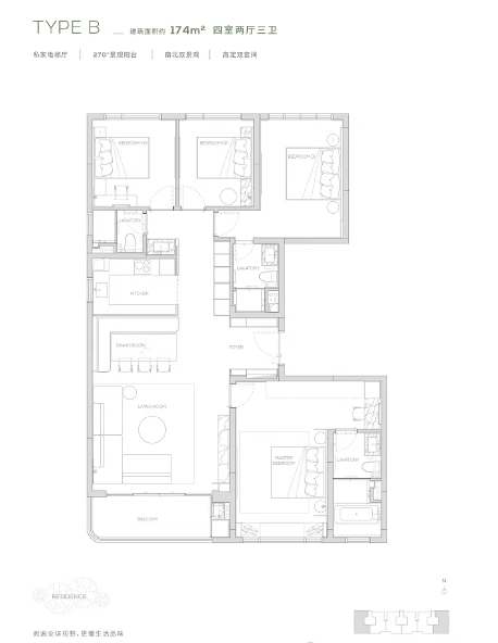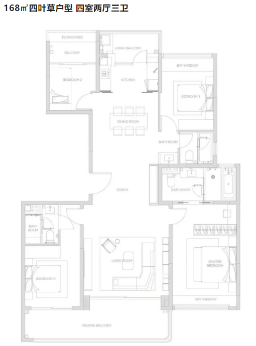 四叶草户型:建面约168平方米的四室两厅三卫户型,采用全铝幕墙的流动感设计,外观大气上档次。