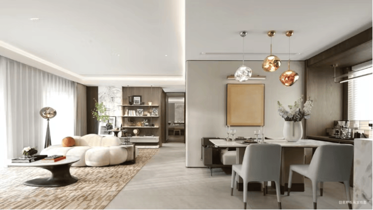 客厅可变多功能区,兼顾办公、亲子、社交场景。