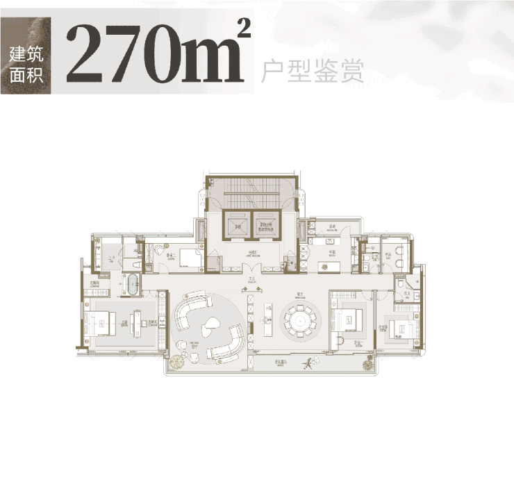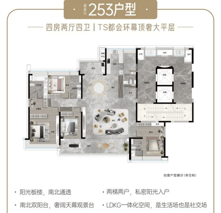 253㎡顶奢五房:环幕景观楼王户型,约 10.3 米超大开间阳台,双套房布局,干湿分区卫浴,全明通透格局。