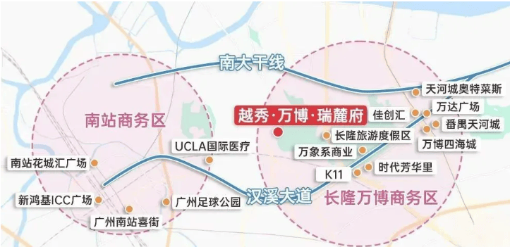 项目坐落于番禺长隆万博 CBD 核心腹地,前身长隆麓府,1999 年优质珍稀地块拿地,越秀携手长隆联袂开发运营。近年万博板块完成重磅扩容升级,规划面积由原本 1.5 平方公里大幅拓展至 7.2 平方公里,规模超越珠江新城 6.19 平方公里规划面积,正式形成长隆万博一体化中央商务区。广州由此构建北天河南番禺全新城市发展双格局,长隆文旅 IP 与万博总部 CBD 深度融合,左手千亿文旅流量,右手万亿总部经济,板块能级持续跃升,成为广州南向发展核心增长极,土地稀缺性与长期升值价值不可复制。项目紧挨长隆野生动物世界西南侧,西邻钟顺路,距离万博 CBD 直线约 5 公里,自驾车程仅 10 分钟,无缝承接板块全维度发展红利,享受 CBD 繁华配套同时,远离核心区高密度喧嚣,兼顾繁华与静谧居住体验。