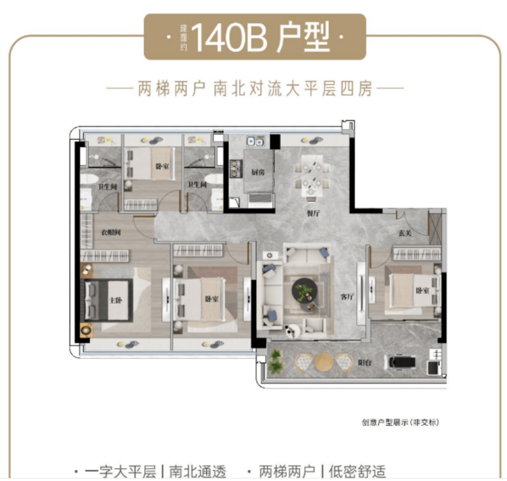140㎡B 户型高定四房:17 层小高层低密产品,约 7.5 米宽阔景观阳台,四开间朝南,南北双向通透,得房率高于片区同面积段户型,居家空间宽敞舒适。