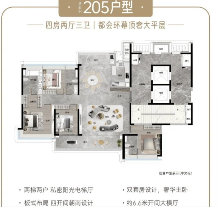 205㎡楼王四房:社区中轴园林景观楼栋,近 9 米双阳台巨幕视野,双主卧套房设计,总统级主卧搭配步入式衣帽间,私密尊崇感拉满。
