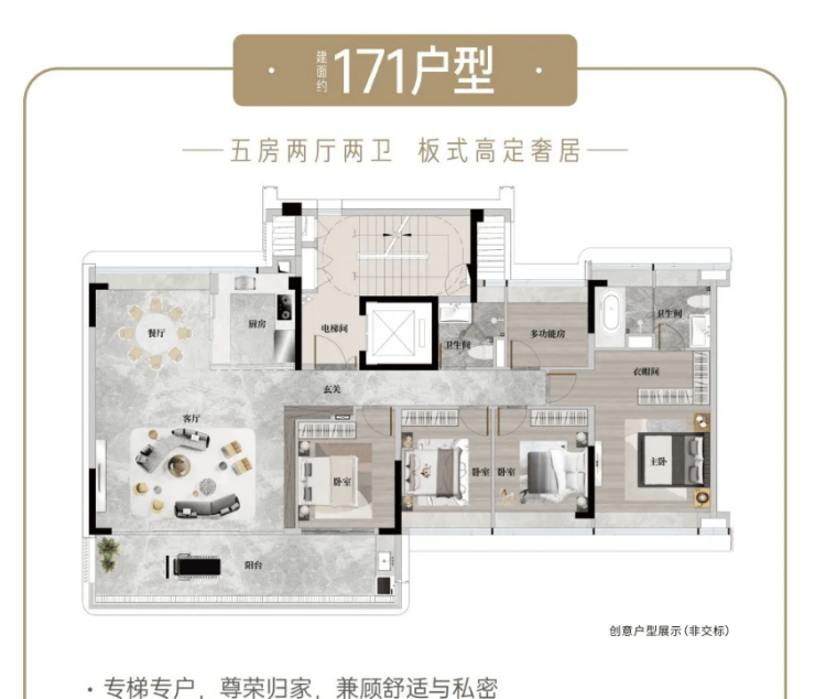 项目当前在售建面约 140㎡、171㎡、205㎡、253㎡纯南向板式大平层,涵盖四房、五房改善户型,同时规划 270㎡空中墅产品,全系专梯入户、专梯专户私密格局。