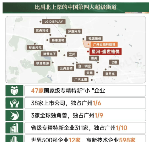 星河·盛世禧悦落子黄埔云埔板块,这里被誉为“广州专精特新第一街”。尽管仅占全市0.6%的土地面积,却贡献了全市1/10的工业增加值,产值规模超2000亿元,经济密度甚至超过荔湾区全域。区域内汇聚34家国家级“专精特新”小巨人企业(占黄埔区50%)、12家世界500强分支机构,包括视源股份(全球教育平板龙头)、明珞装备(特斯拉产线供应商)、禾信仪器(质谱技术国产化先锋)等硬科技代表。